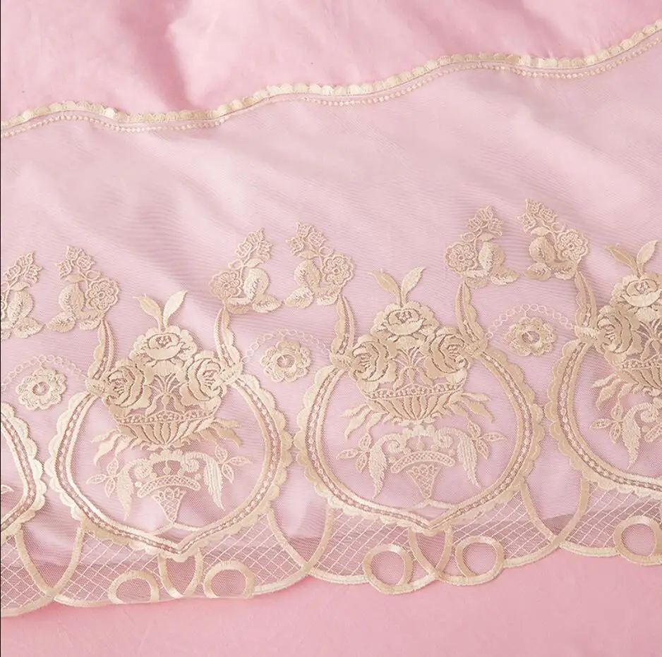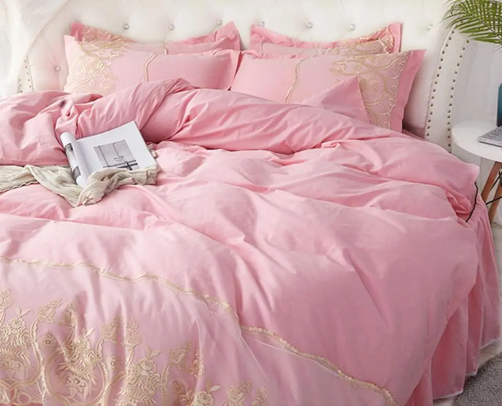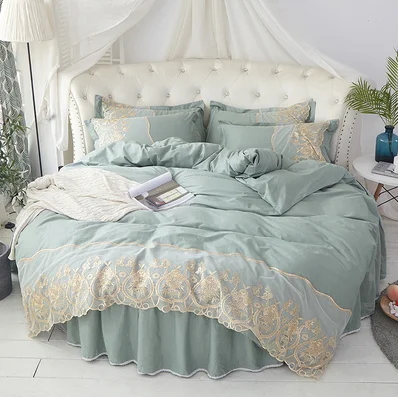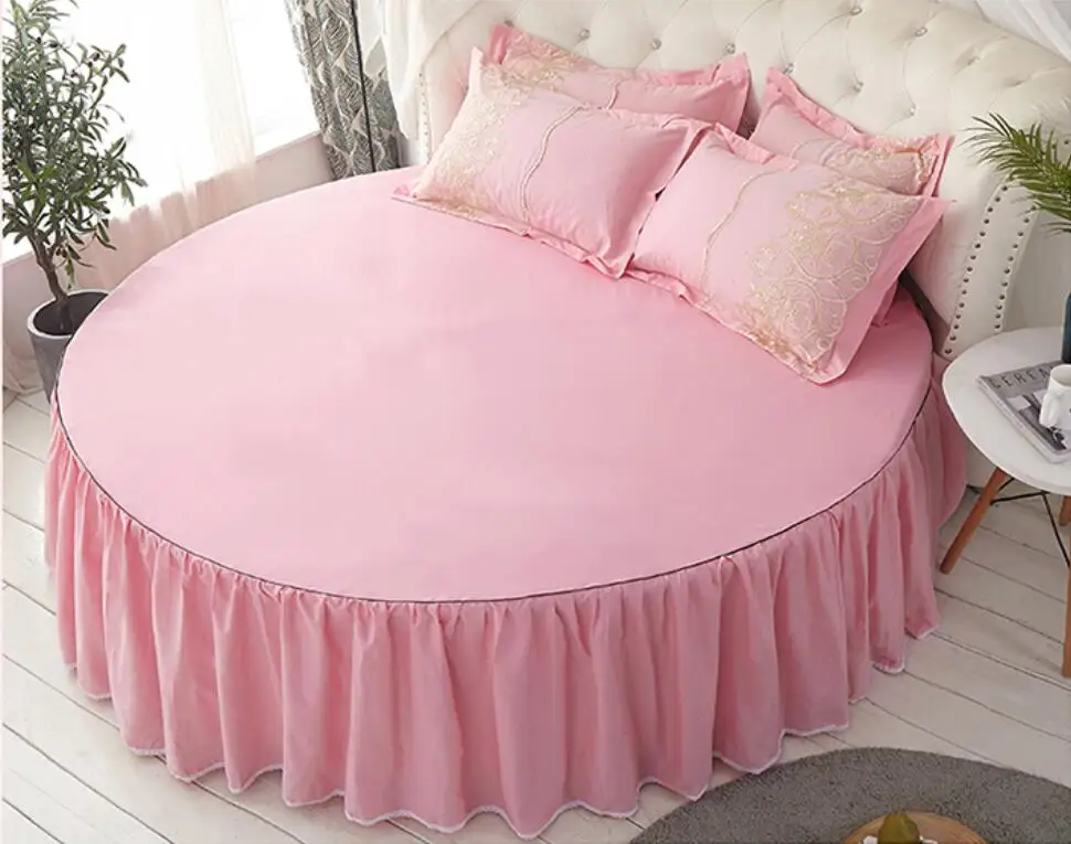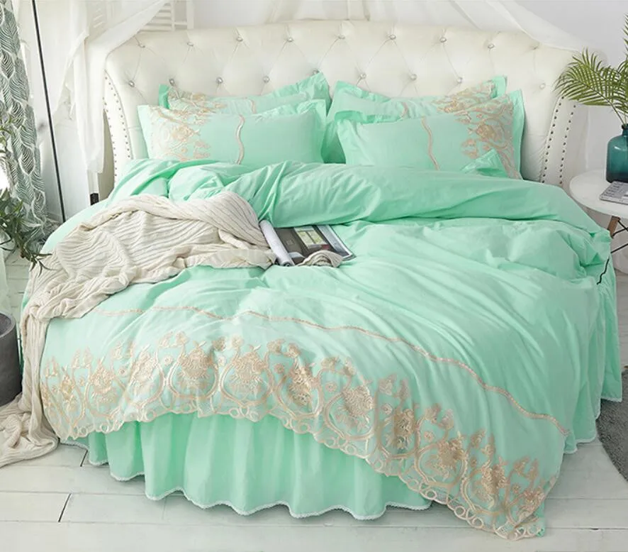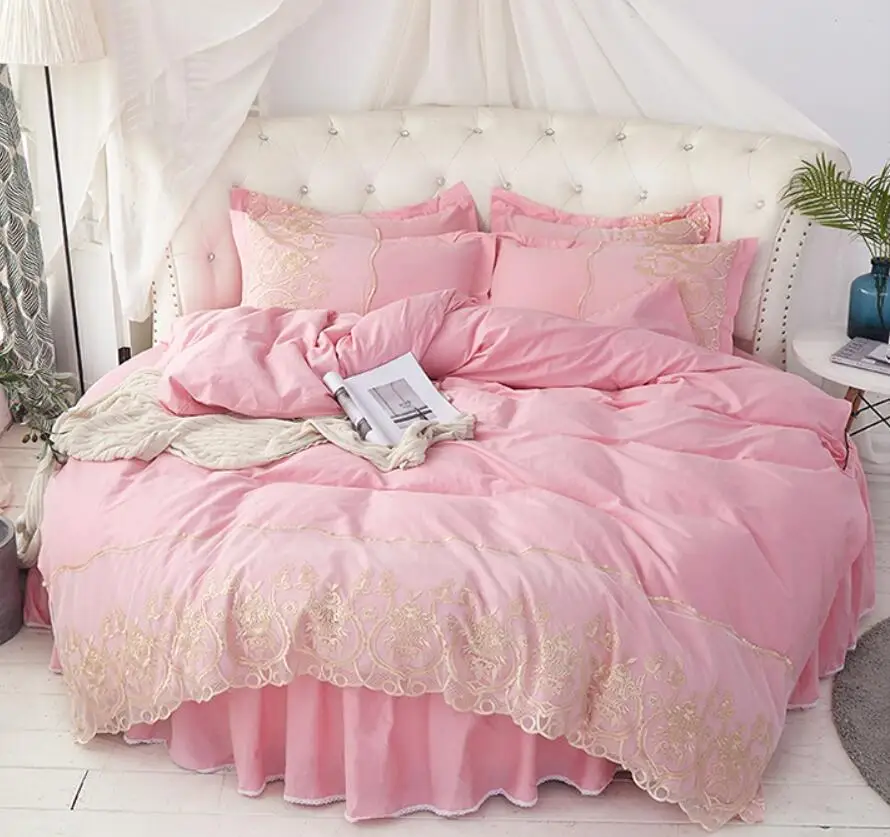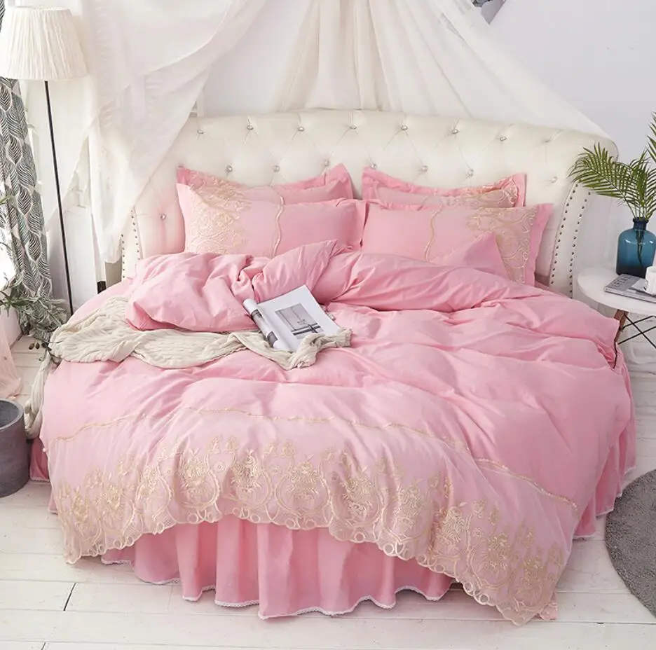 100% Cotton 200cm 220cm Round Bed 4 PCS  Active Print Embroidery Lace Edge Pillowcase & Duvet Cover Fitted Sheet Sets