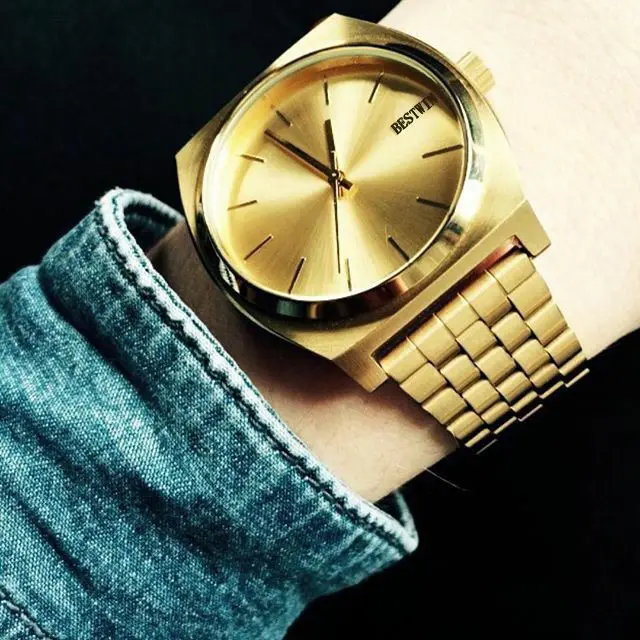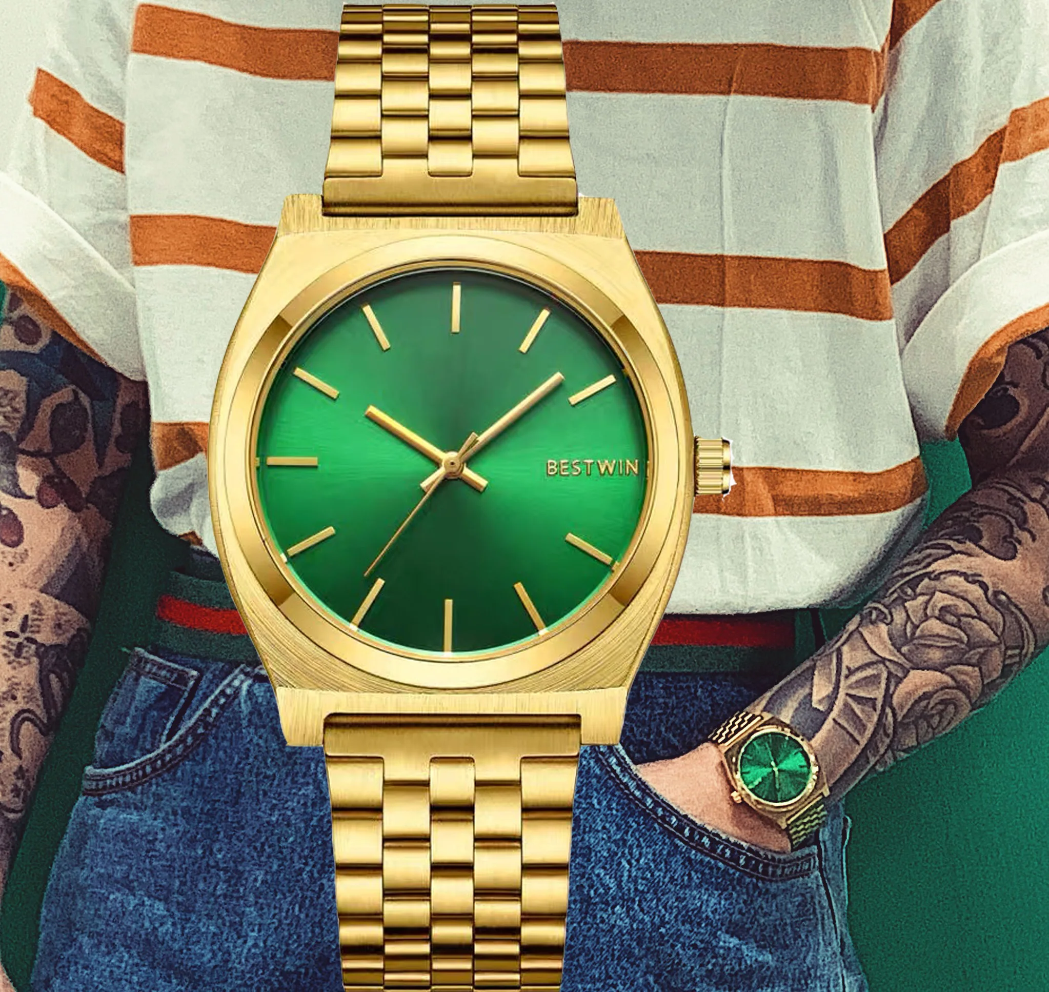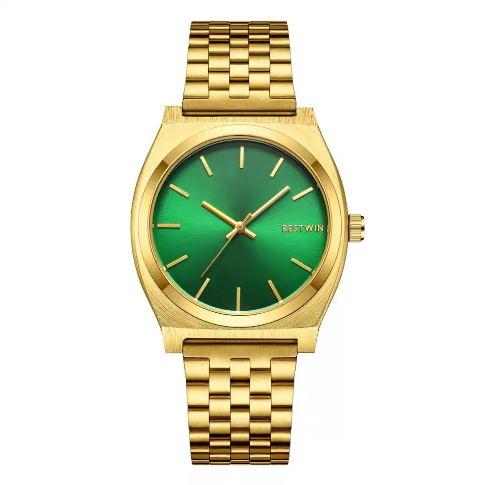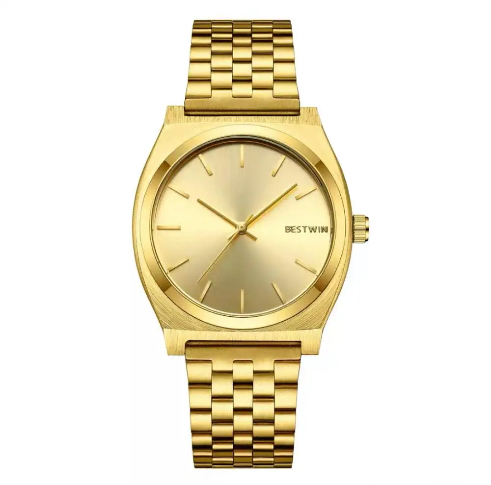 Brass band not fade 2021 high quality new men's watch steel strap gold plating calendar quartz watch gold retro carving
