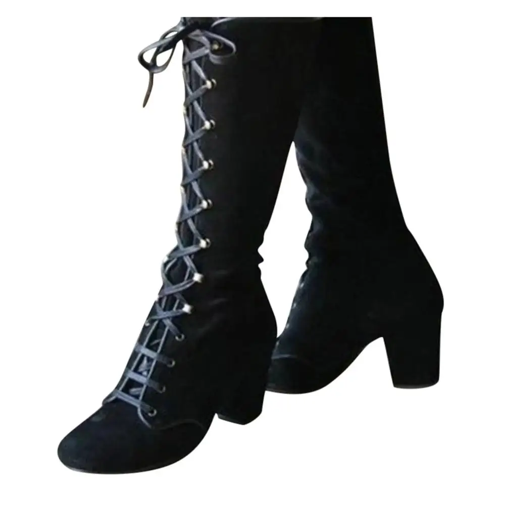 2021 Black Boots Women Shoes  Knee High Women Casual Vintage Retro Mid-Calf Boots Lace Up Thick Heels Shoes