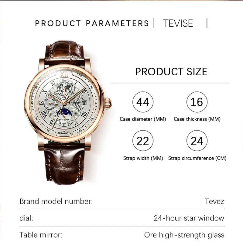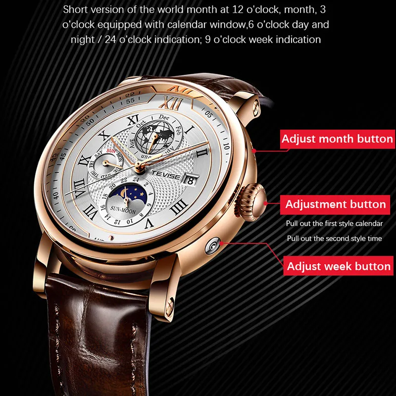 Product features: automatic date, moon phase, 24 hours, week display!