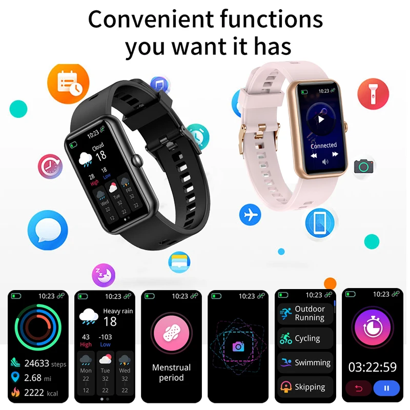 24 multi-sports modes: outdoor running, indoor running, walking, cycling, mountaineering, spinning, yoga, gymnastics, boating, basketball, football, swimming, skipping, badminton, table tennis, tennis, baseball (softball), volleyball , Cricket, Rugby (American Football), Hockey, Dancing, Jumping, Sit-ups, Running, Cycling In APP, connect the mobile phone GPS to get the movement track, and pace, etc.