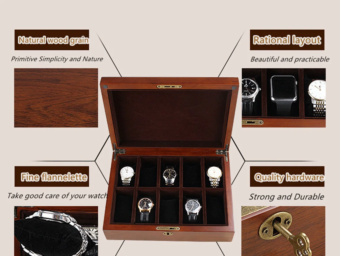 2022 10-Slots Solid Wooden Watch case 5 Seats Luxury Watch Organizer Box Wood Storage Box with Lock Jewelry Gift Case for Man