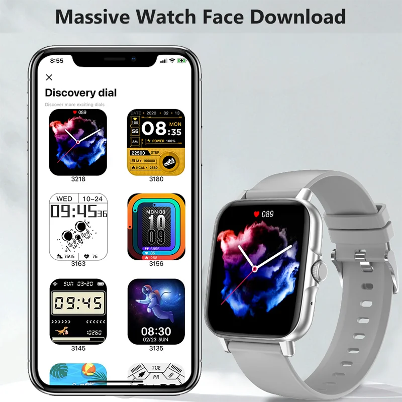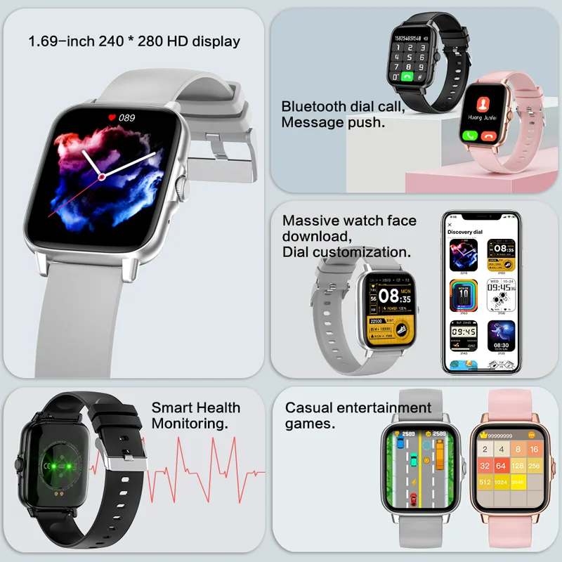 Custom wallpaper. Bluetooth call, music control, social APP message reminder, incoming call reminder, SMS reminder, heart rate/blood pressure/blood oxygen monitoring, multi-sport, alarm clock reminder, sedentary reminder, mobile phone search, music playback, stopwatch