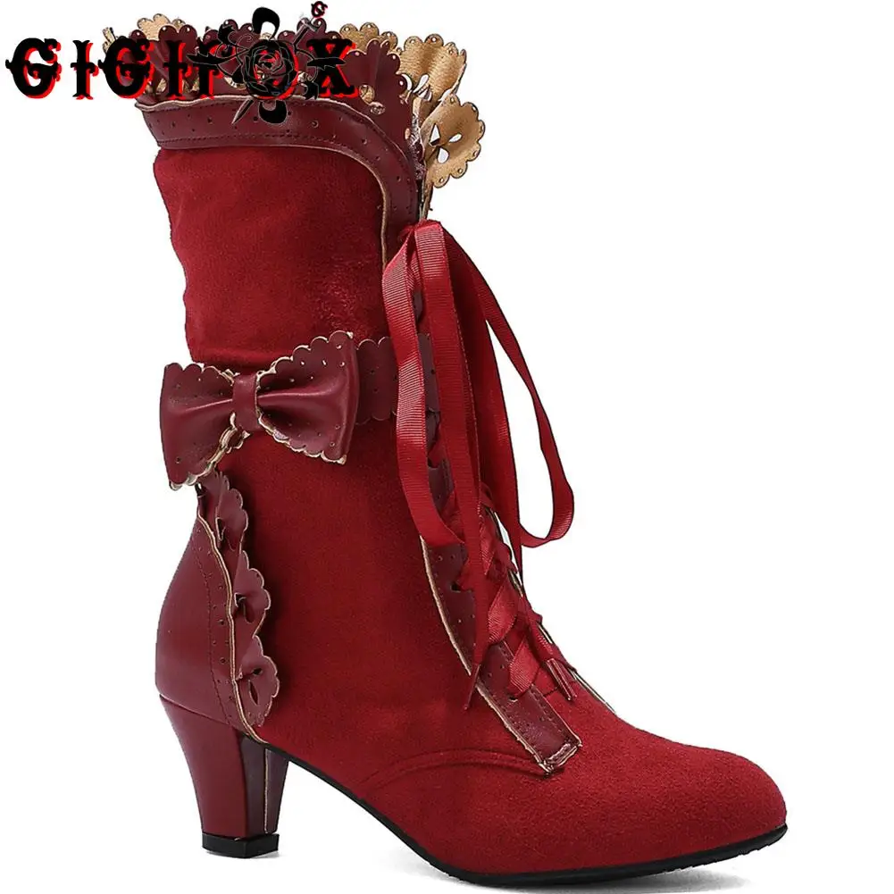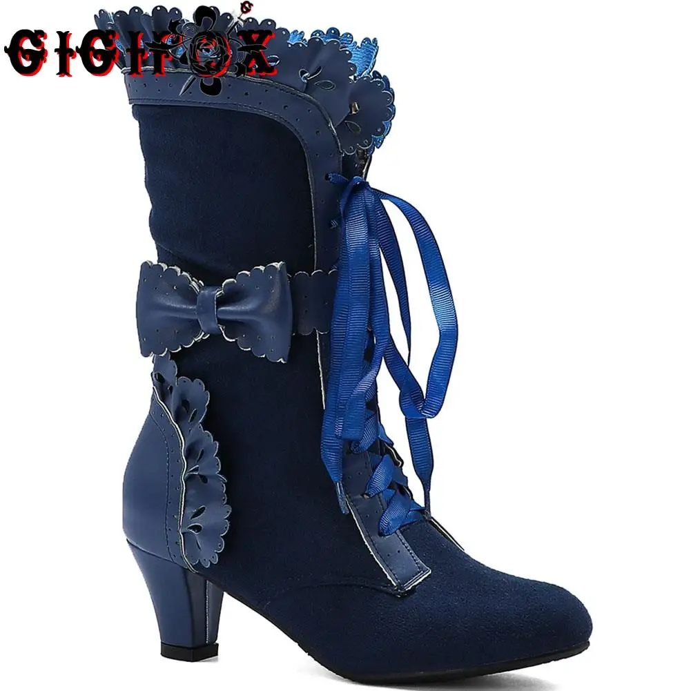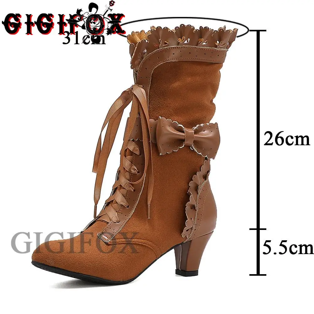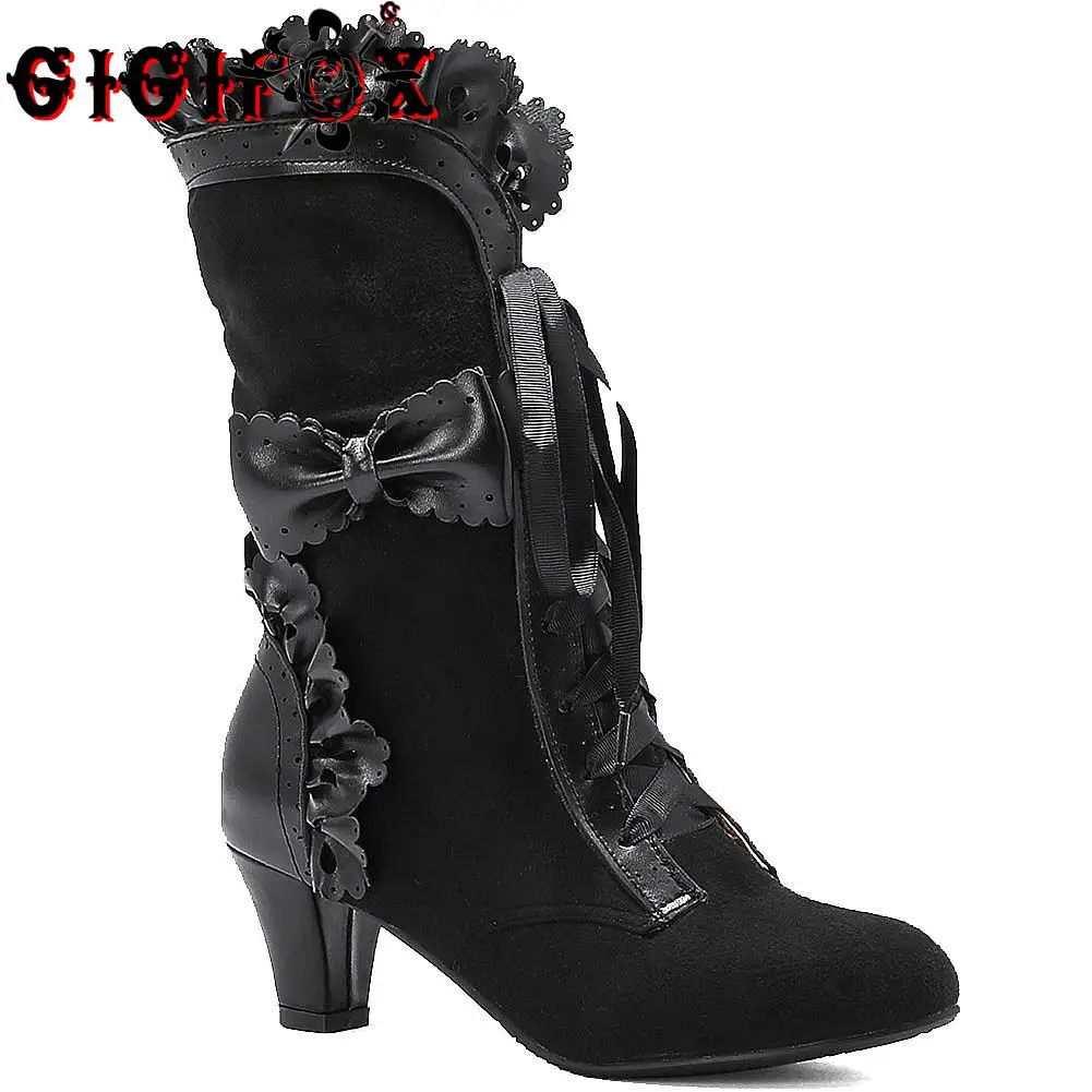 Brand New Big Size 43 Sweet Bowknot Ruffles Med Heels Shoelace Gothic Lolita Style Mid Calf Boots Women Shoes