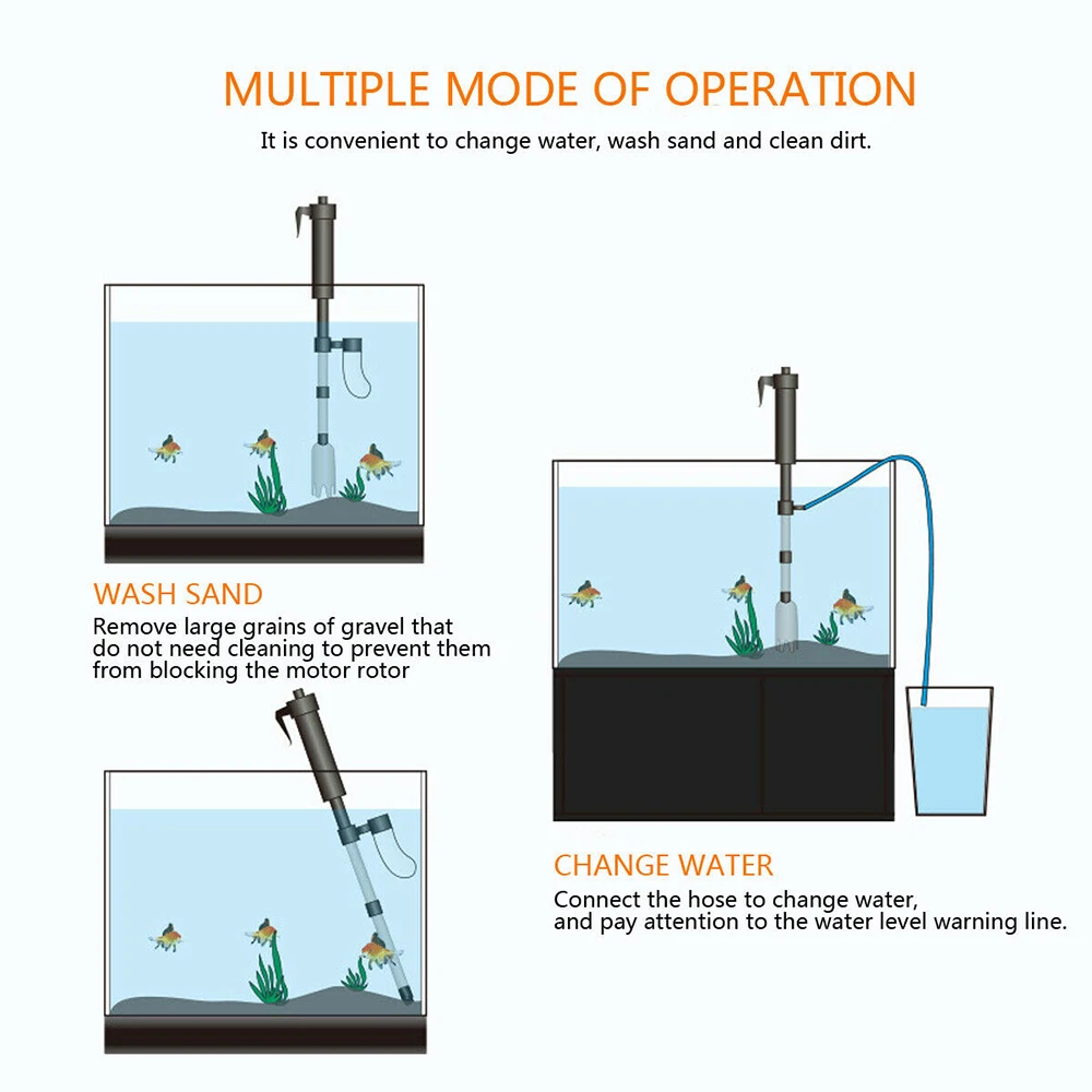 1. When installing the fish tank water changer, please be sure to submerge the water changer in the water and exceed its starting water level line(MIN), and then turn on the starting switch.Otherwise, the product will not start properly.