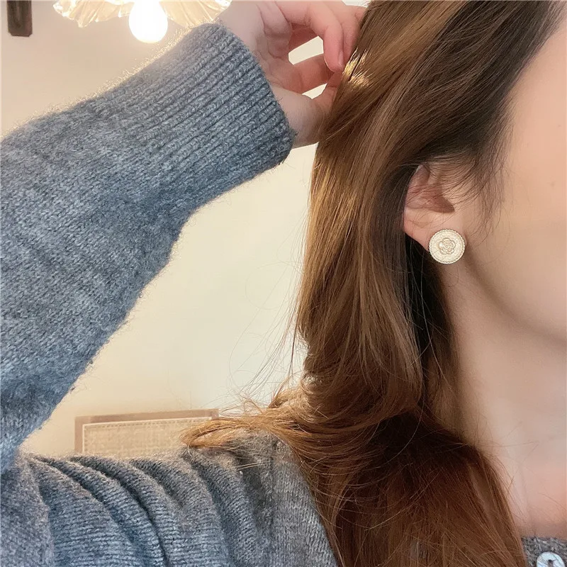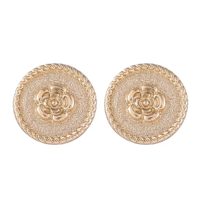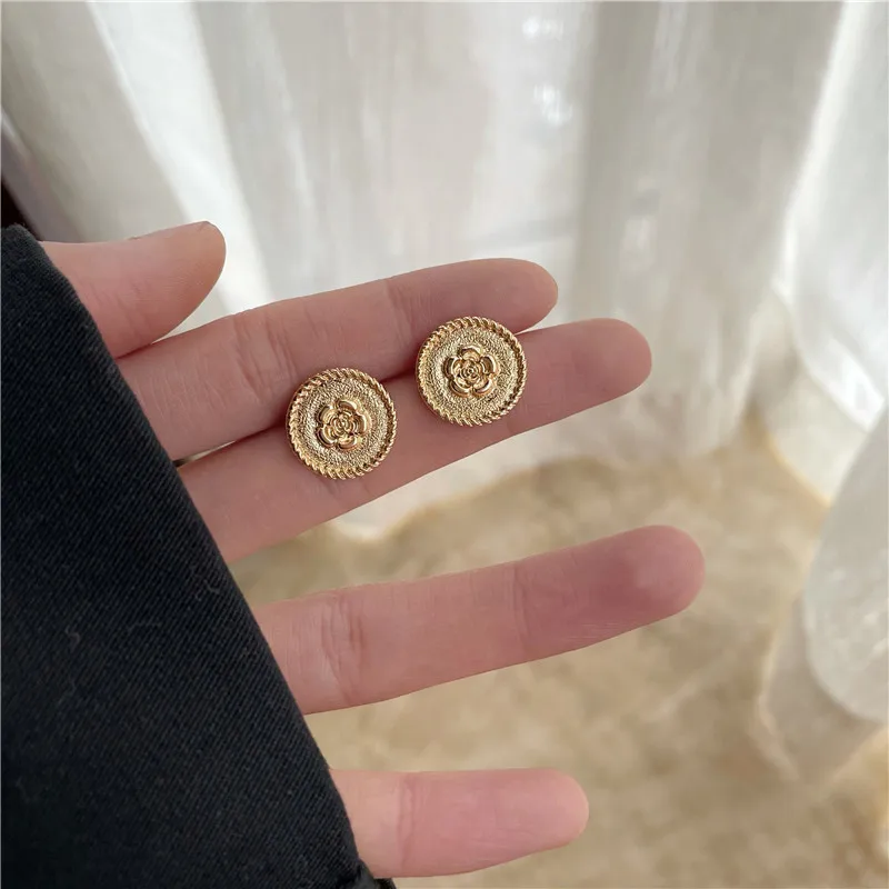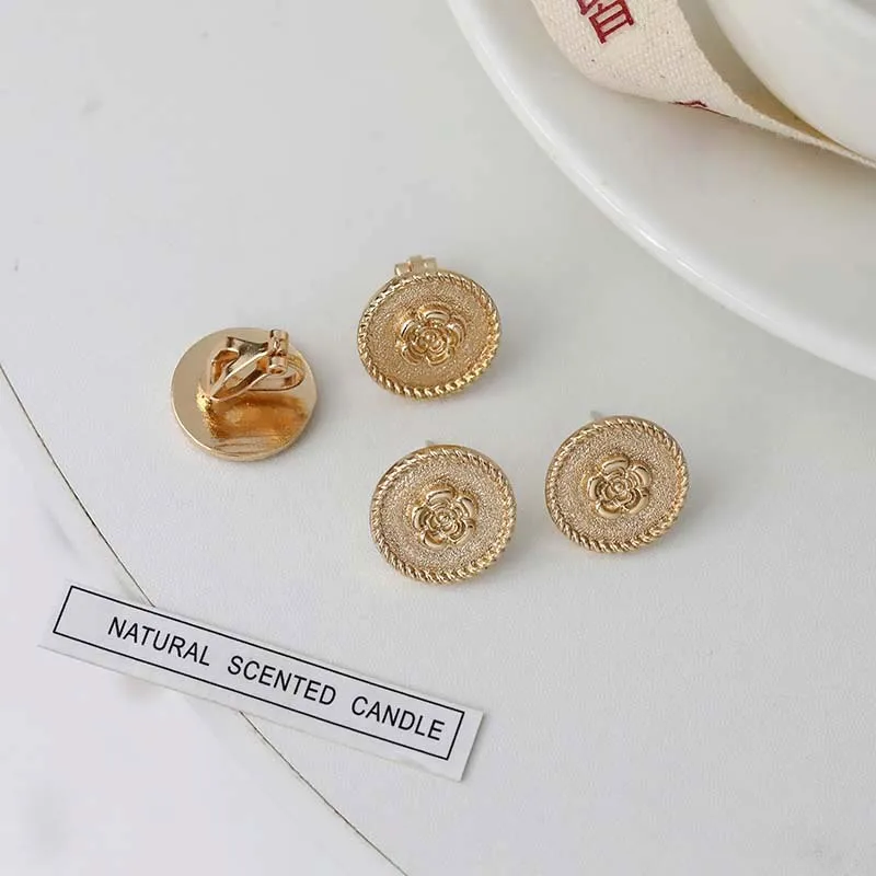 French Trendy Matt Gold Color Small Flower Round Clip Earrings Exquisite Camellia Flower Ear Clips Earrings Without Pierced Lady