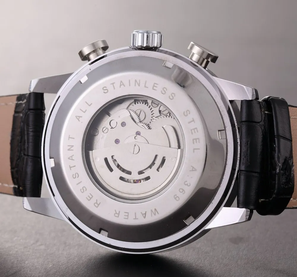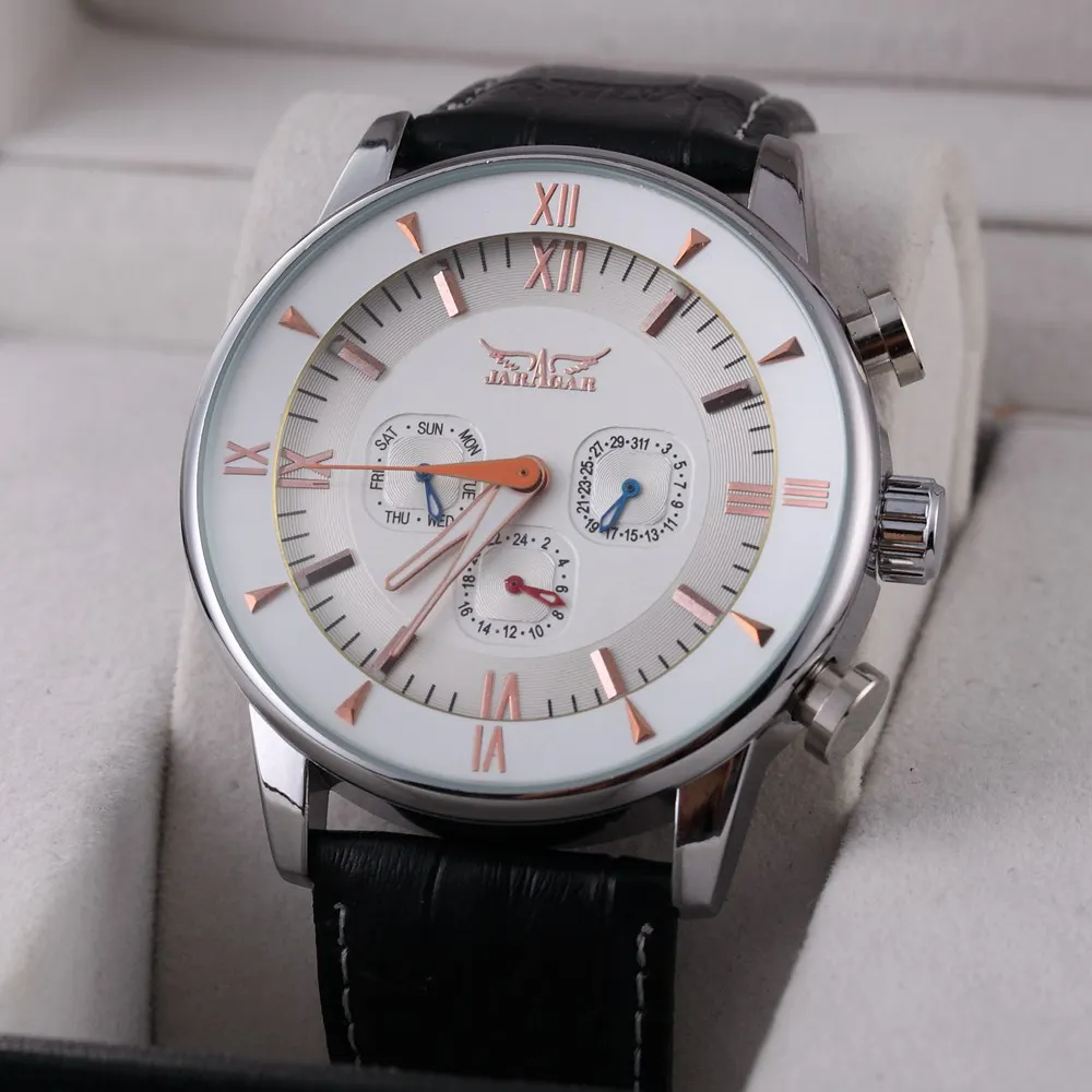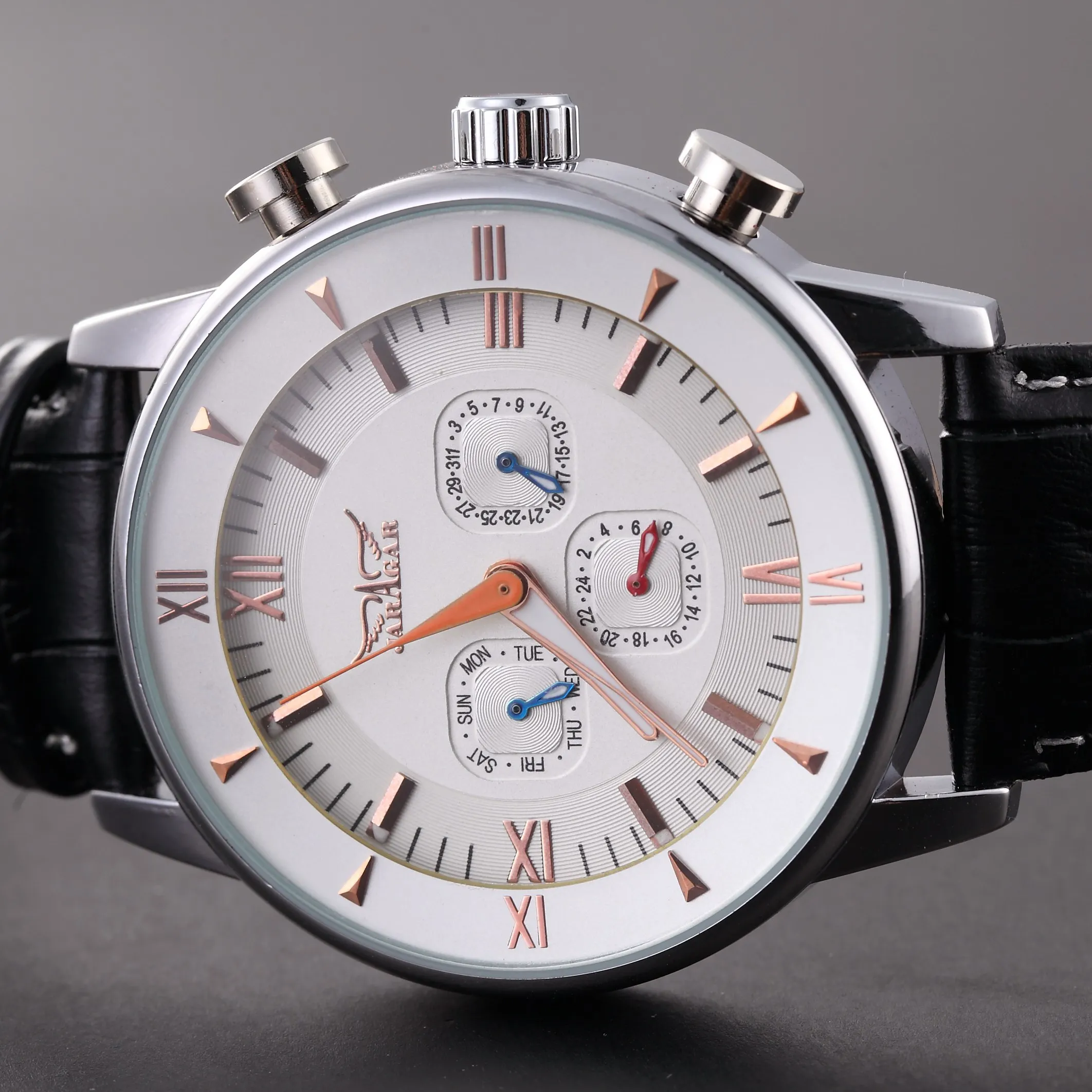 JARAGAR Brand Automatic Mechanical Watch Mens Fashion Dress Wristwatches Black Rose gold Dial Leather Band Watch 24 H Auto Date
