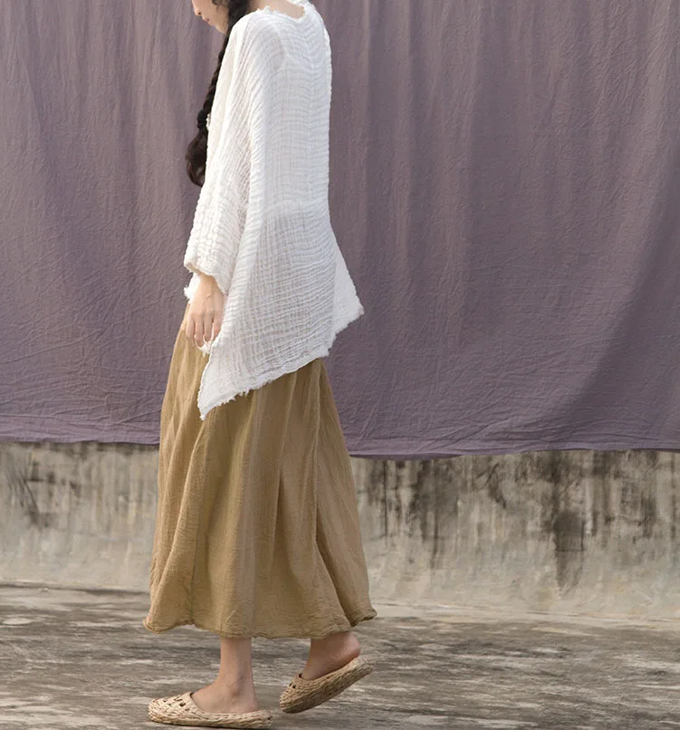 Johnature Women Khaki Cotton Linen Skirts Vintage Elastic Waist 2021 Summer New Original Female Clothes A-Line Skirts