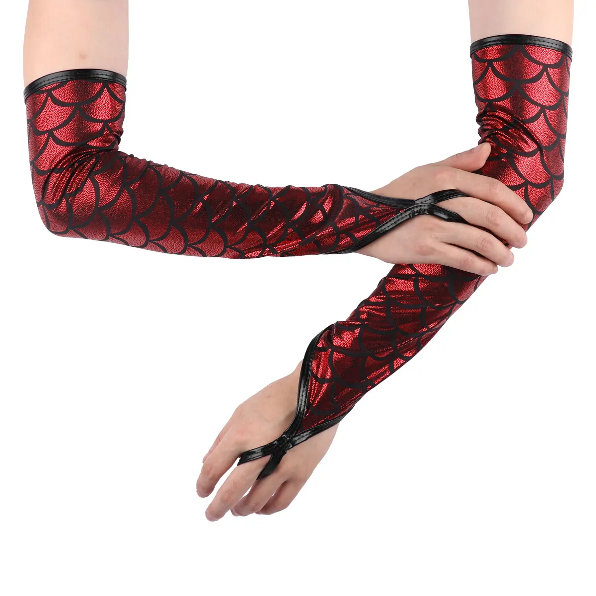Elbow length, fingerless style with a loop at the middle finger. Allover with metallic fish-scale printed pattern.