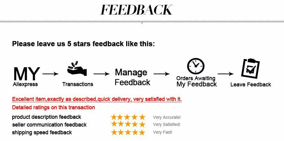 We will leave POSITIVE FEEDBACK after receiving the payment. Please contact us if you are not satisfied with the item after receive it.