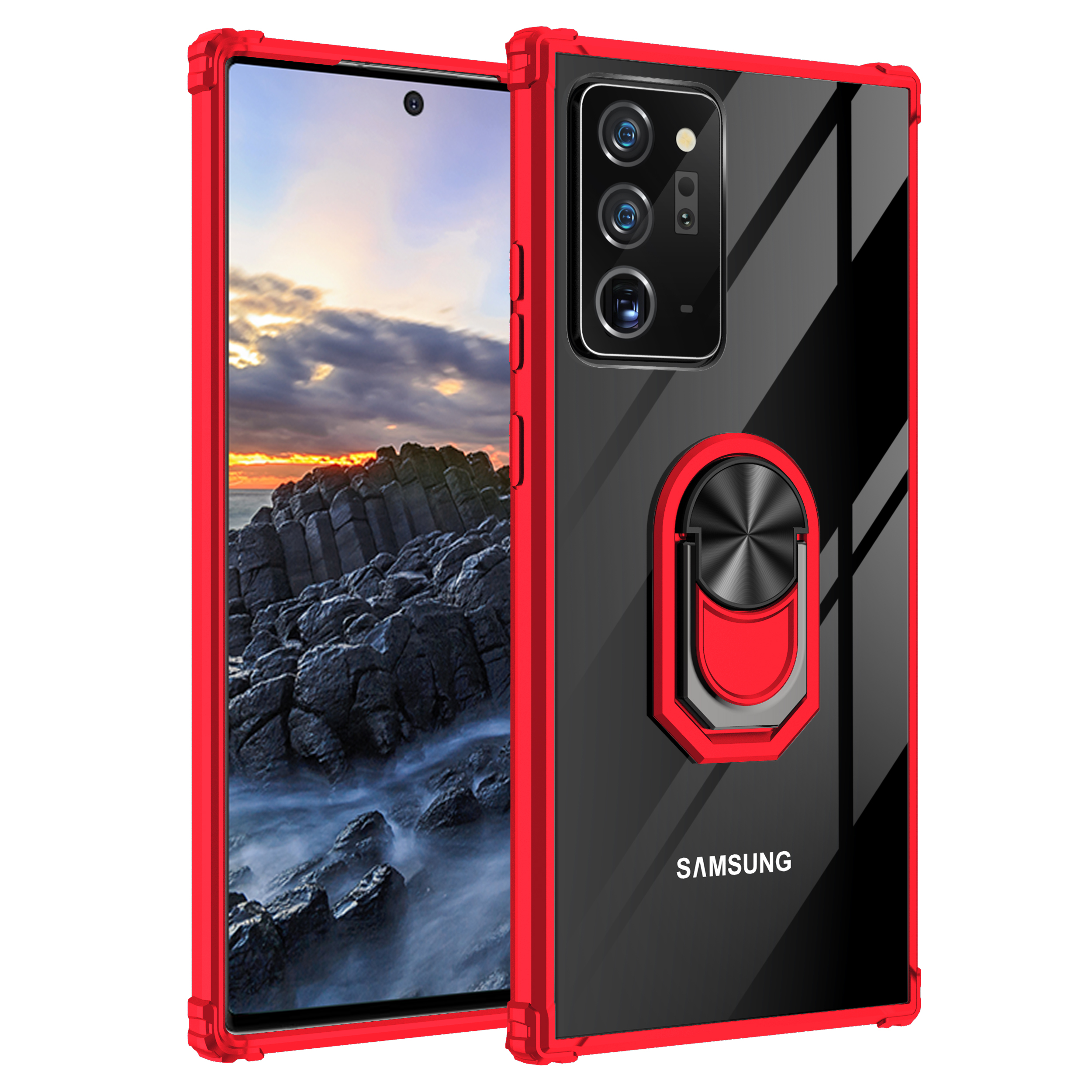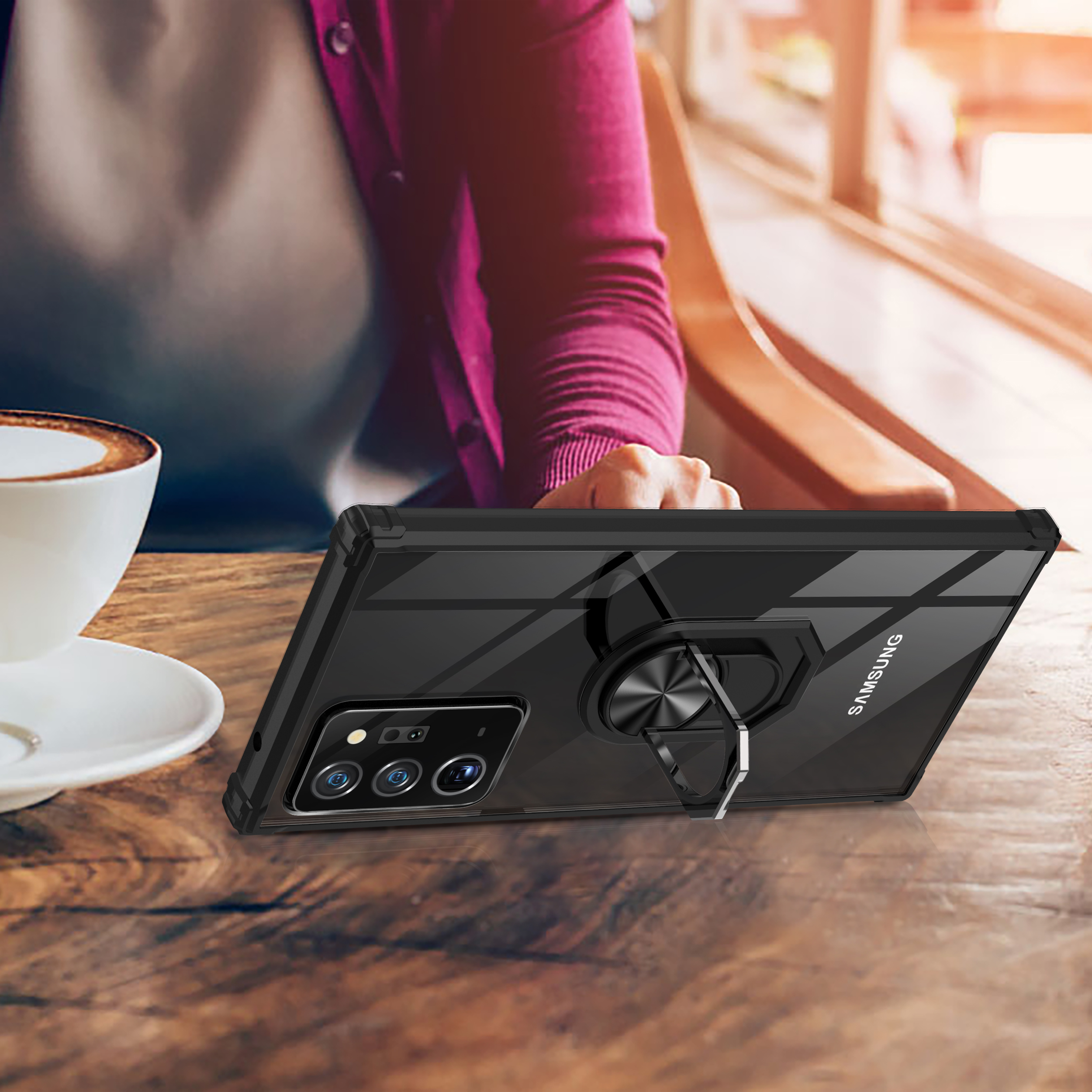 Military Acrylic Rugged Armor Shockproof Case For Samsung Galaxy Note 20 Ultra Magnetic Metal Ring Stand Transparent Back Cover