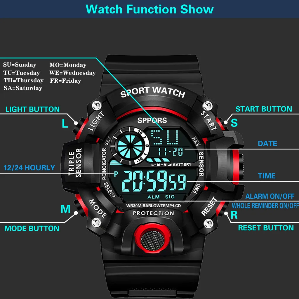 Watch Function: Stopwatch, Alarm,Lighting dispaly, water resisit,Time, Week, Date , Month display,Multifunctional sport, 12/24 Hourly