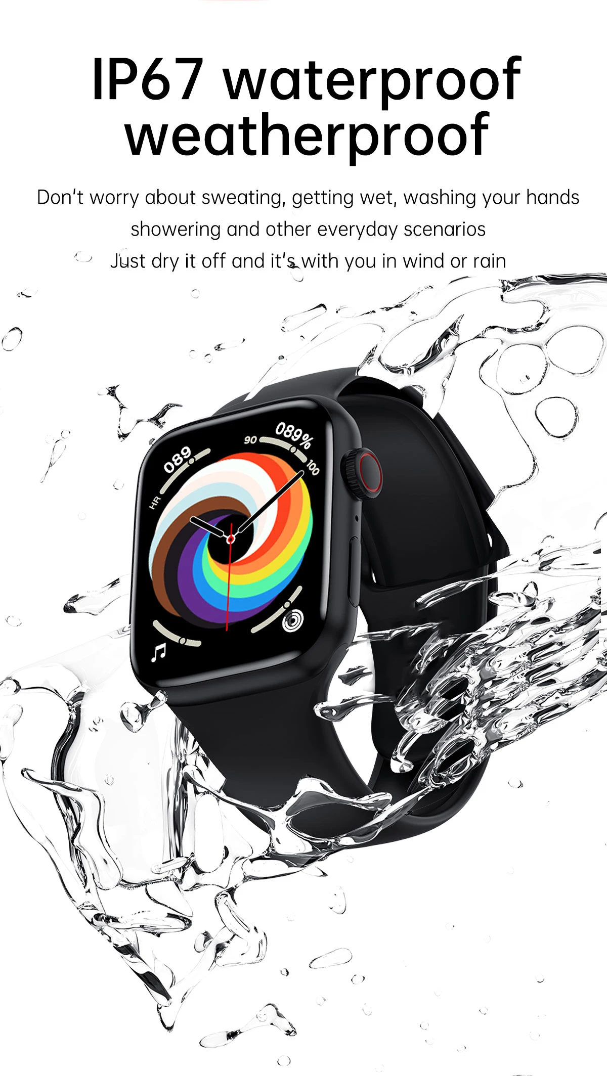 IP67 life waterproof, please do not bring your watch to swimming, diving, bathing and sauna!