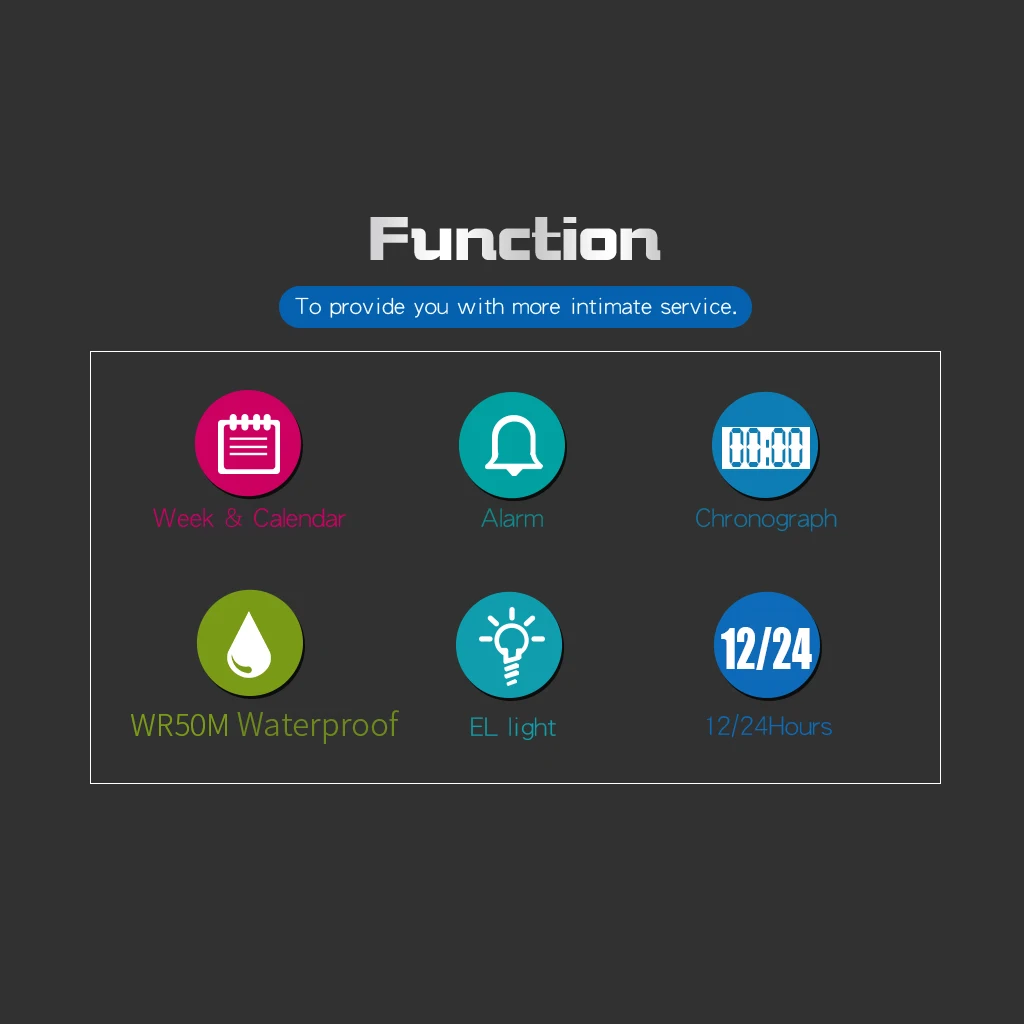 Running seconds, alarm clock, luminous, hourly hour, day of the week display, 12/24 hour system, WR50M waterproof life