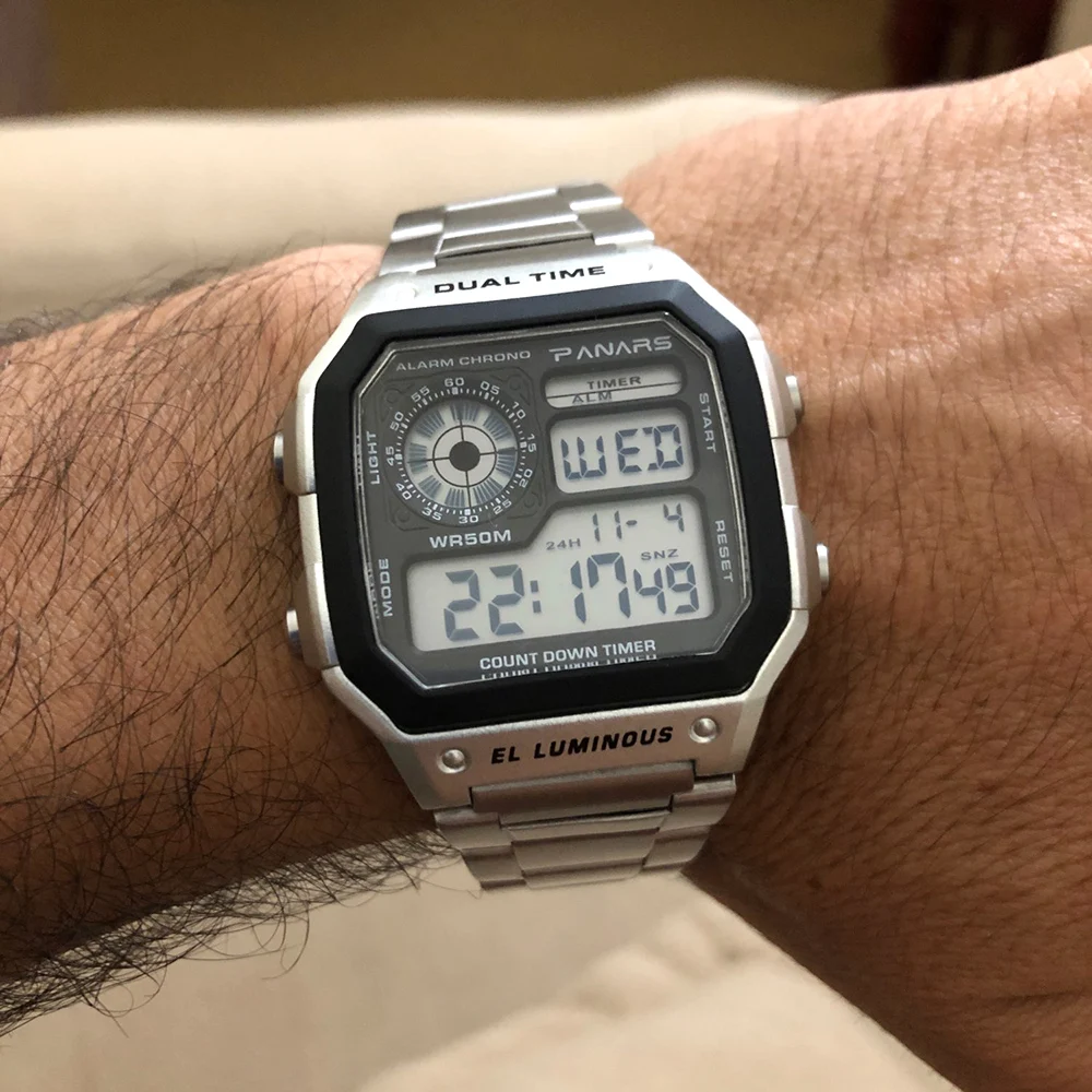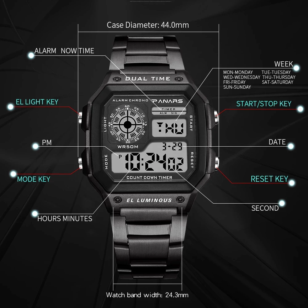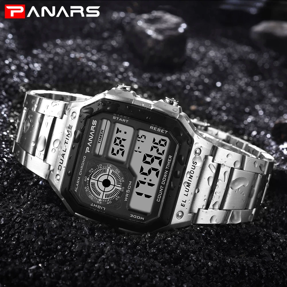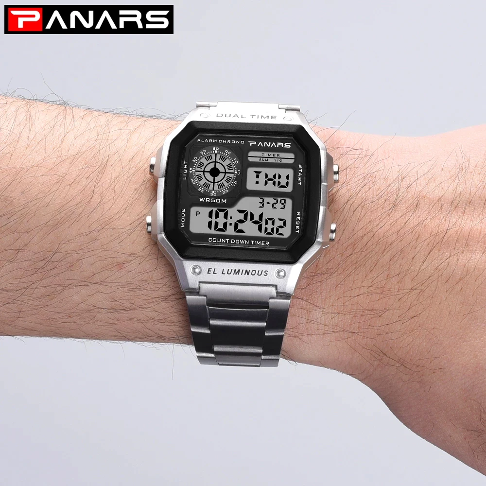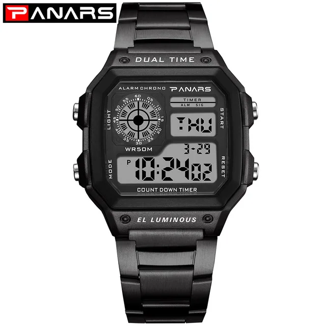 PANARS Men Sports Watch Multifunction Alarm Clock Chrono Waterproof Wristwatch Gold Steel Male Digital Watches Relogio Masculino
