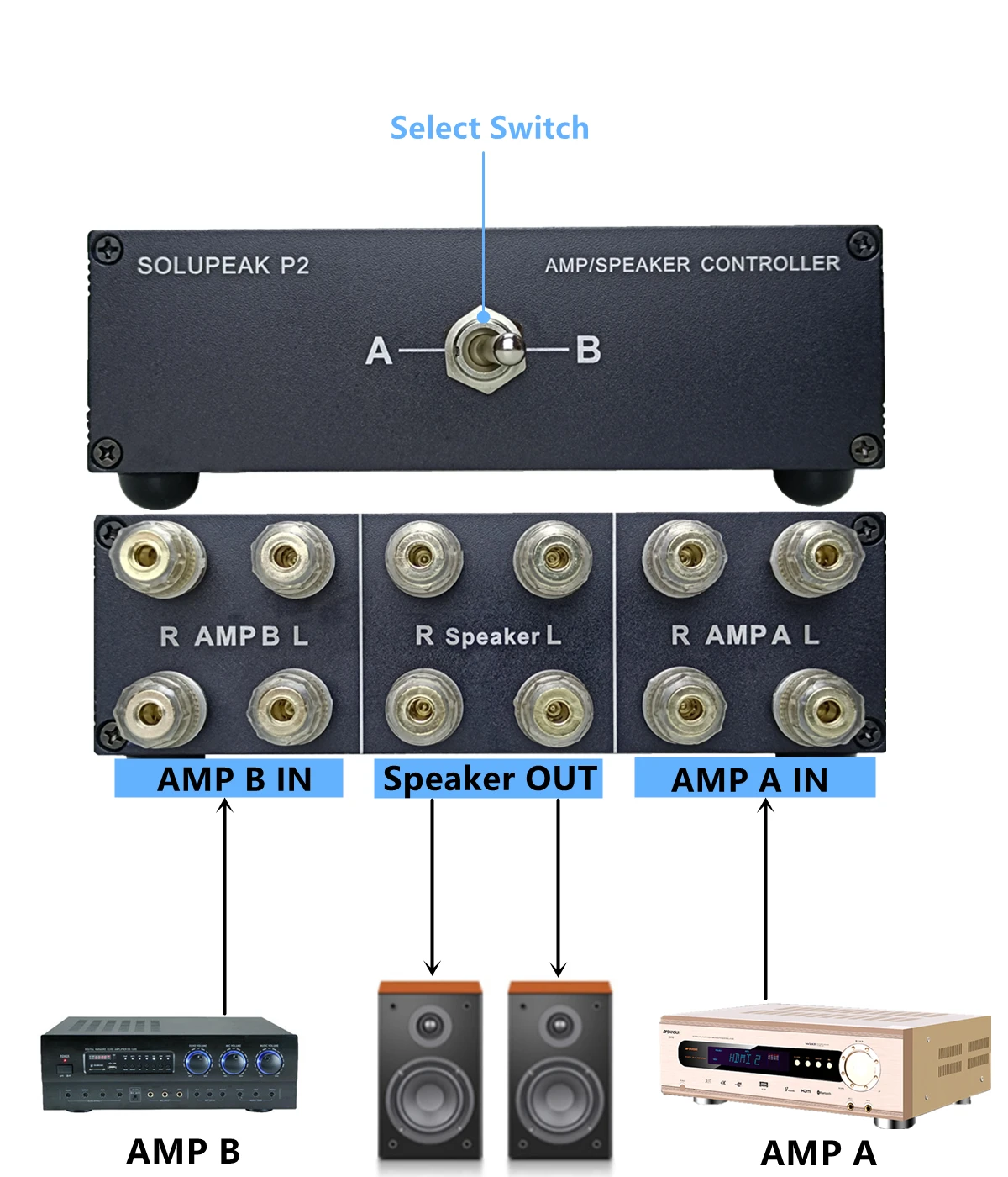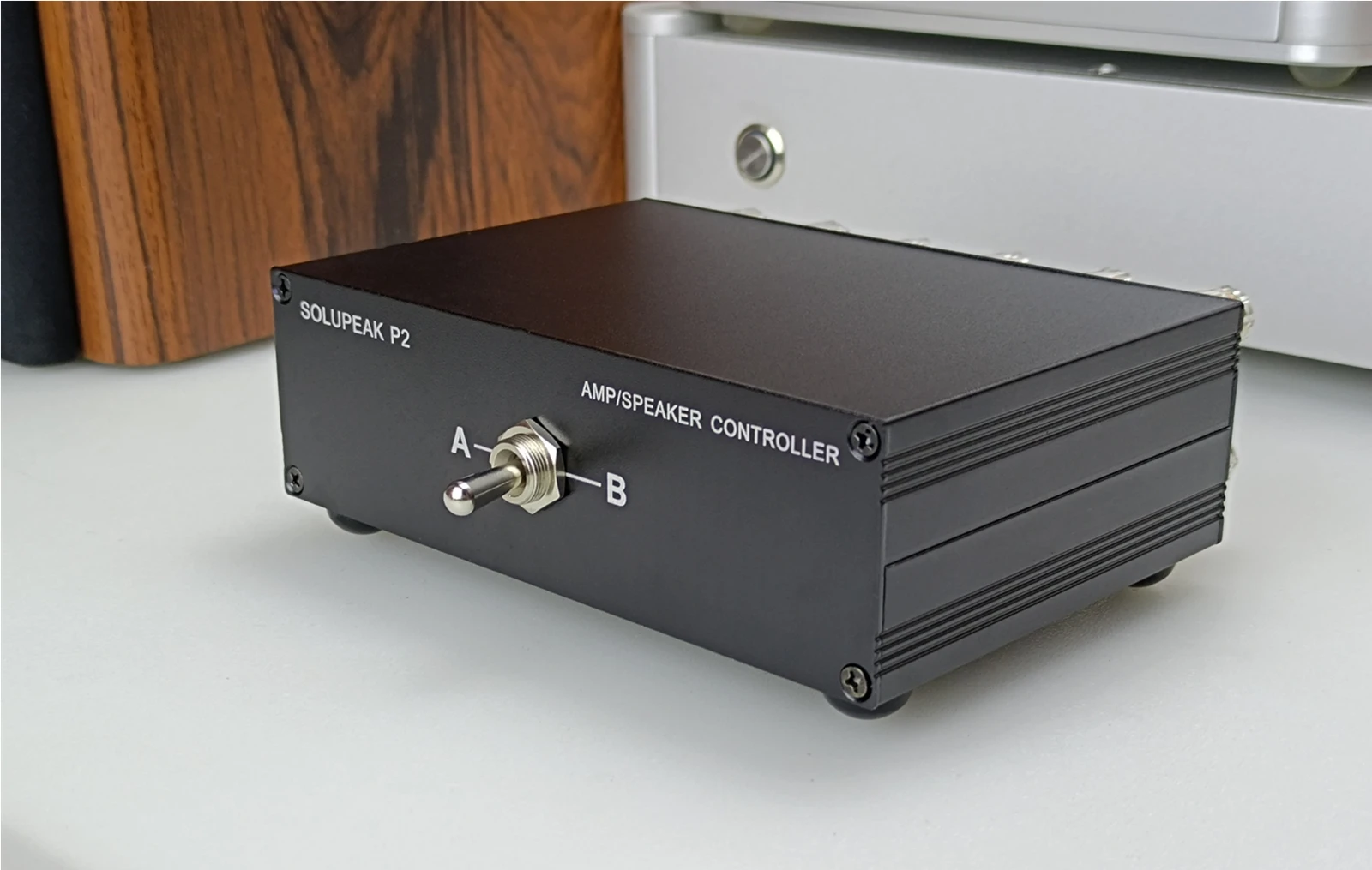 SOLUPEAK P2 is a high quality 2-way speaker source selector box, it is designed to accept two stereo audio sources such as two amplifiers or receivers to share use of one pair of loudspeakers, just through the A/B toggle switch in front.
