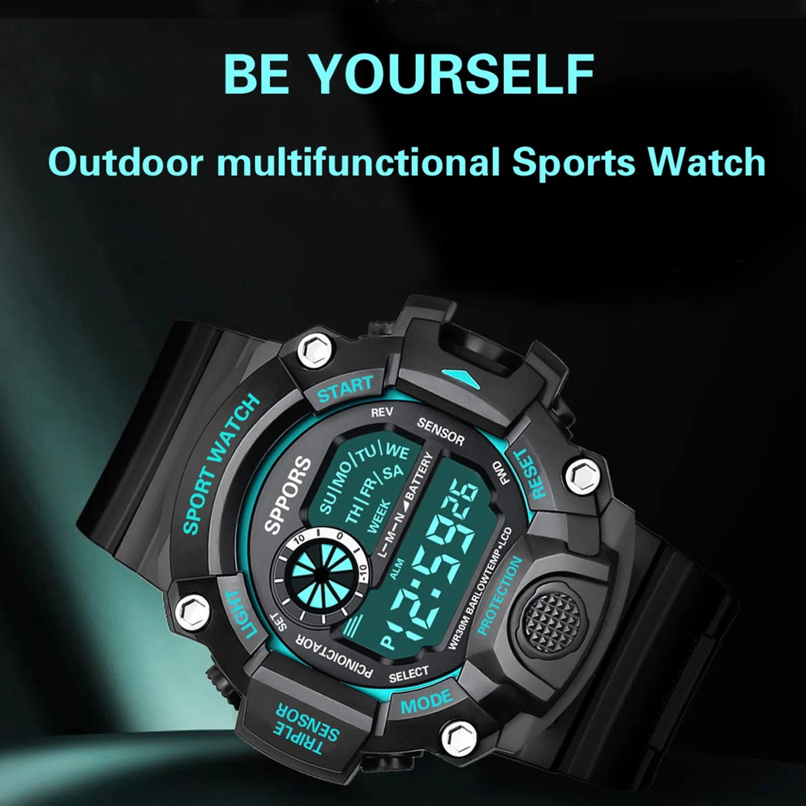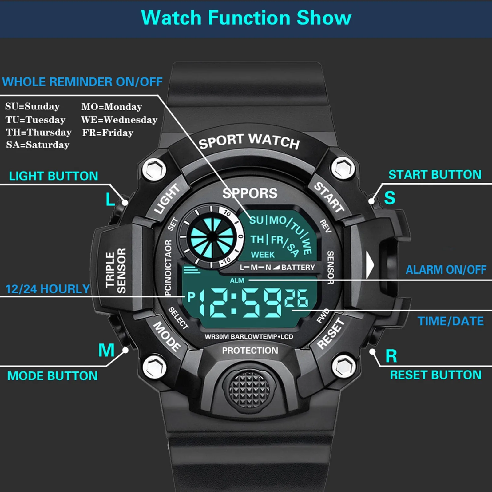 Watch Function: Stopwatch, Alarm,Lighting dispaly, water resisit,Time, Week, Date , Month display,Multifunctional sport, 12/24 Hourly