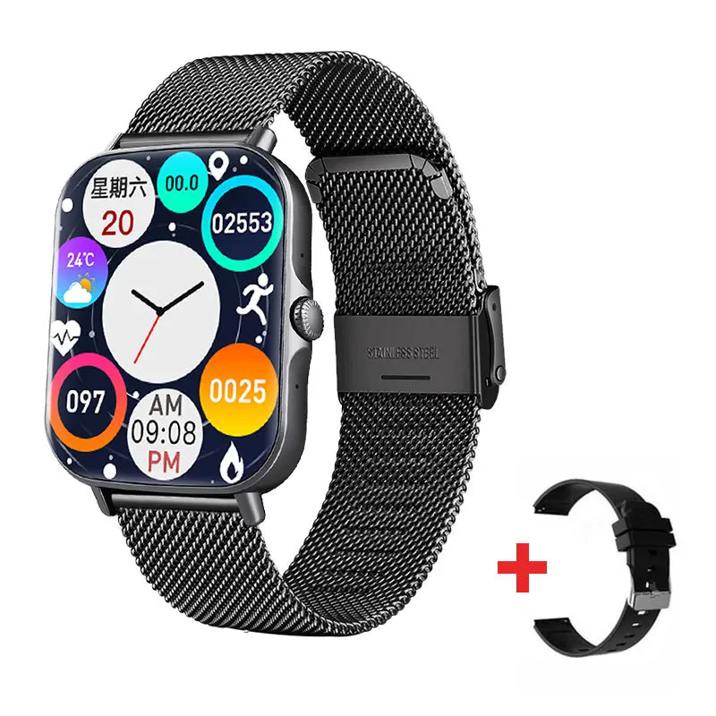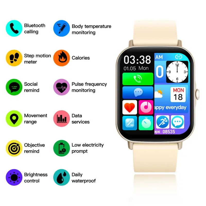 1.[Main functions]: Call, play music, body temperature monitoring, sleep monitoring, heart rate monitoring, blood pressure, blood oxygen, step counting, distance, calories, stopwatch, multi-sport modes (walking, running, cycling, basketball, football , badminton, skipping rope, table tennis, tennis, baseball, yoga), call reminder, message reminder, alarm clock reminder, sedentary reminder, drink water reminder, medicine drink reminder, remote control photo, raise your wrist to brighten the screen, etc.