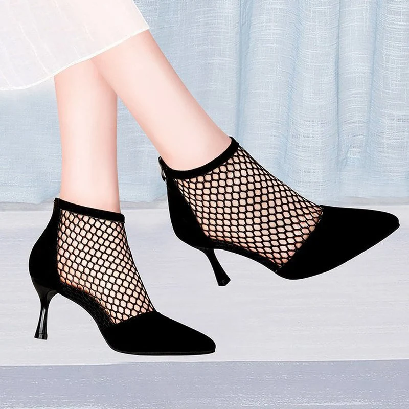 Summer Women High Heels Sexy Fishnet Ankle Boots Heels Suede Heels Pointed Toe Cool Sandals Boots Thin Heels Ladies Casual Shoes