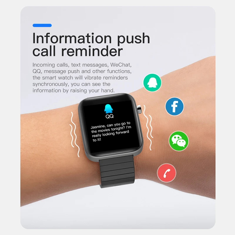 Time, steps, distance, calories, sleep monitoring, multiple exercise modes, sedentary reminder, shutdown, call reminder, information push (wechat, QQ, Facebook, line, WhatsApp, kakao talk, etc.) body temperature monitoring, timer, mobile phone search, multi language, heart rate monitoring, blood pressure monitoring, blood oxygen monitoring, flashlight.