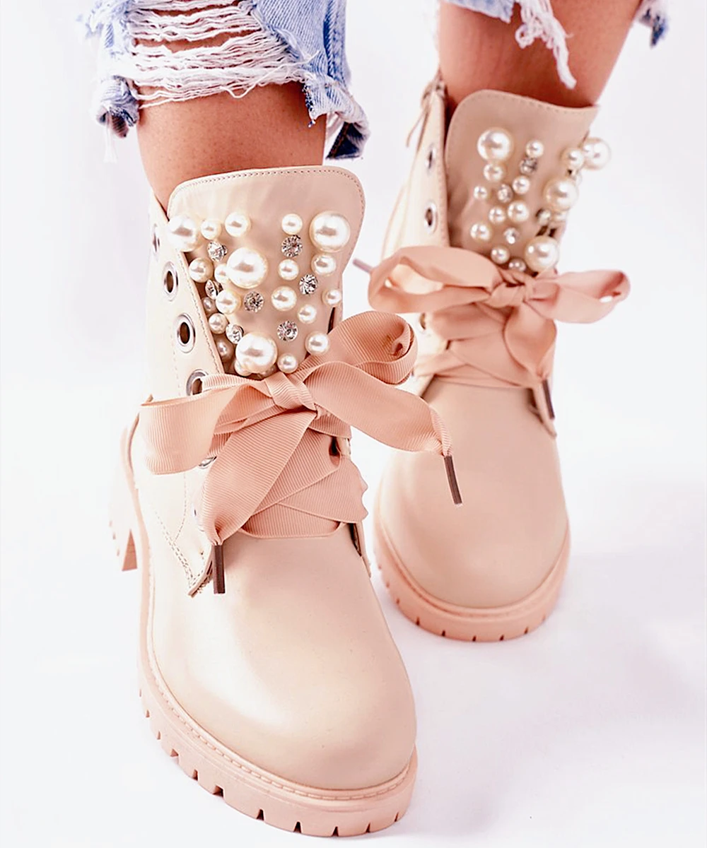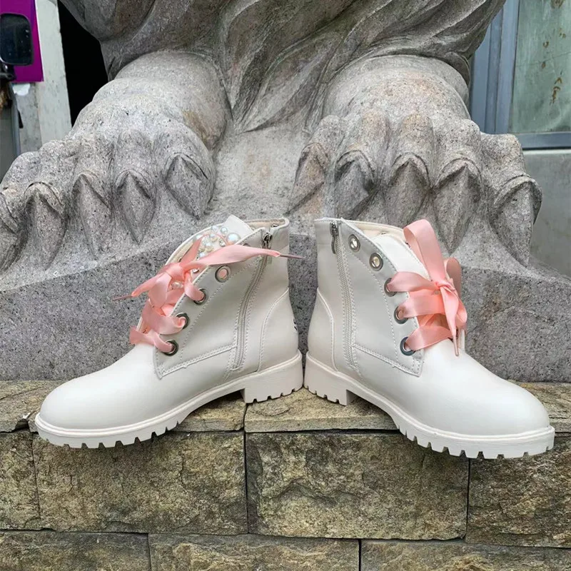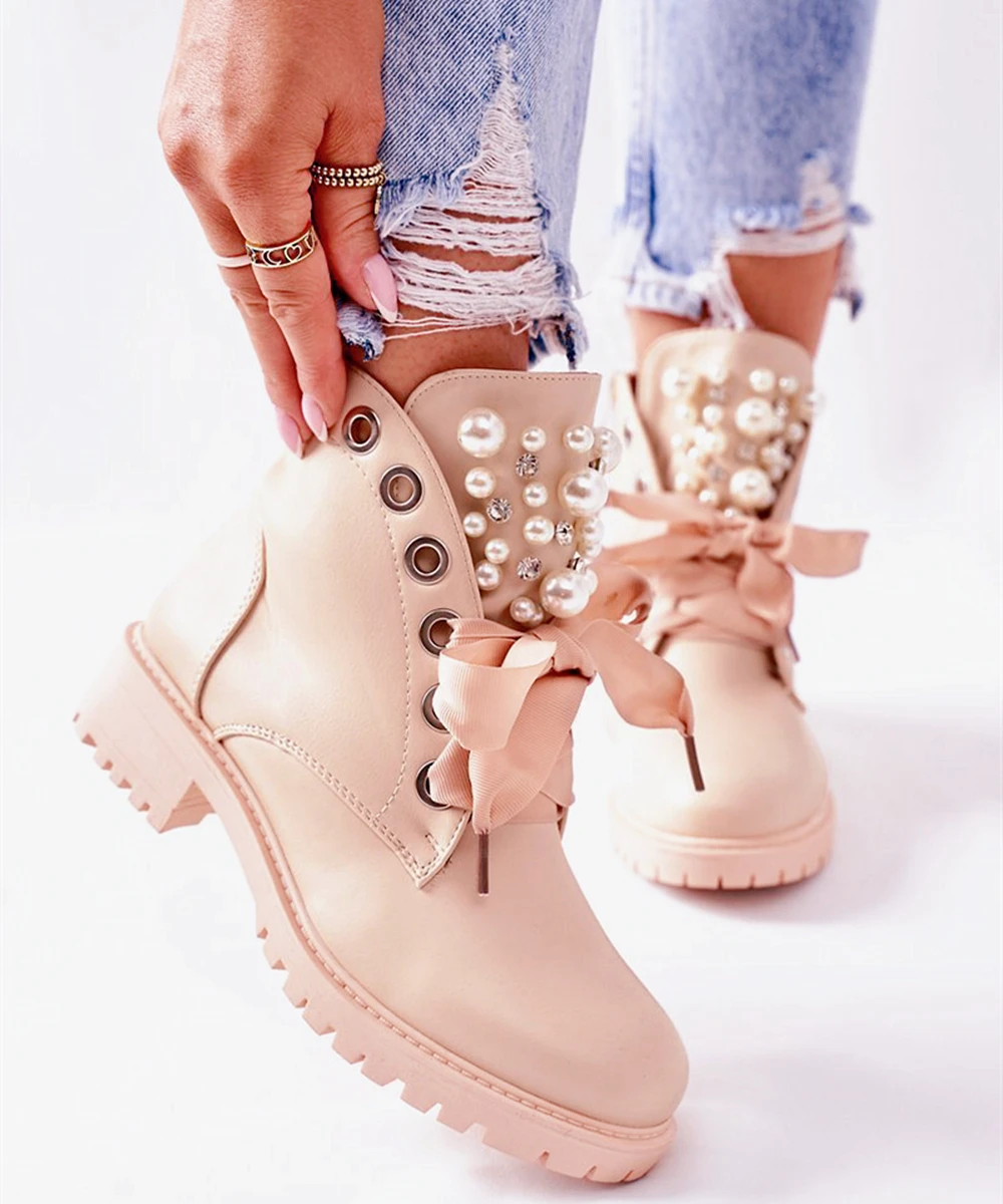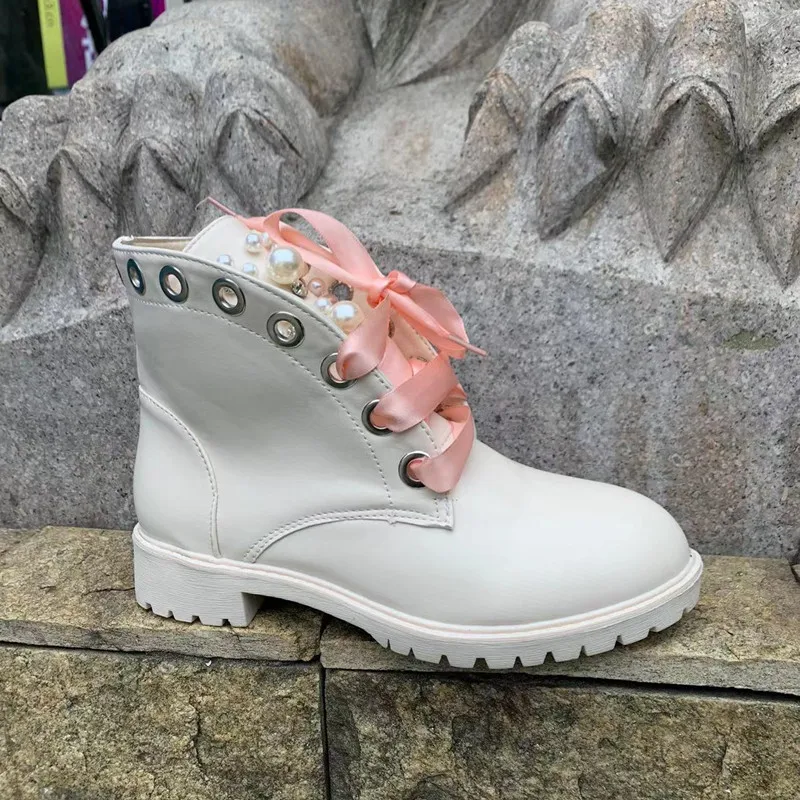 Women Ankle Boots 2022 Autumn PU Leather Lace Up Motorcycle Boots Pearl Decor Casual Shoes Round Toe Lady Bootie Female Footwear