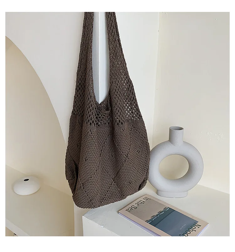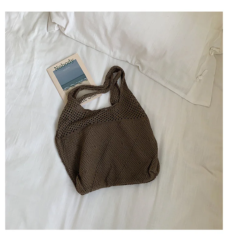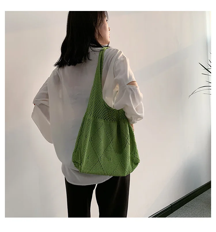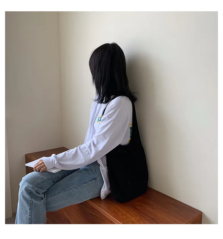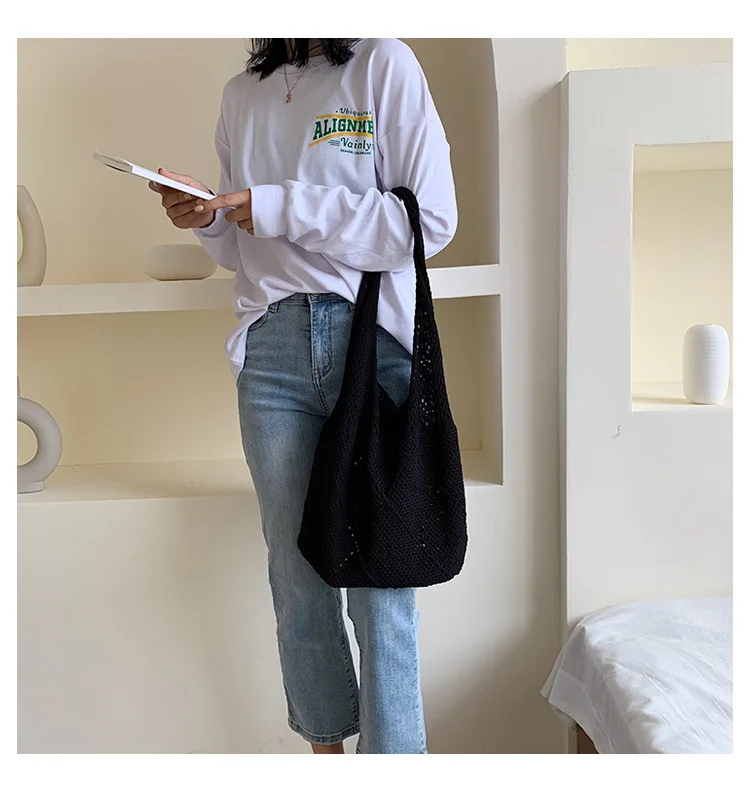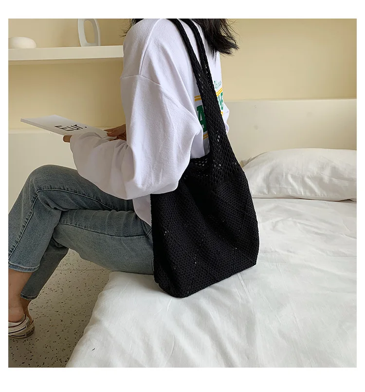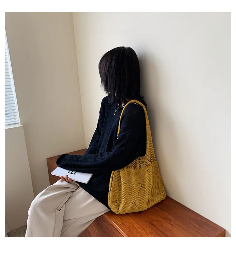 Handmade Lady Retro Chic Crochet Handbag Korean Fashion Knitting Hollow Out Vest Shape Black Yellow Top-handle Tote Bag