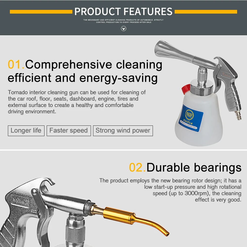 The machine is connected to the air compressor, and it revolves on its own axis at a high speed inside the cleaning gun trumpets of the circular pipe of the air compressor 0.4-0.9Mpa (58-130PSI) (optimal working pressure is 0.7Mpa, it shall not exceed 1Mpa). The cleaning liquid generates atomization effect under the strong centrifugal force generated by the high speed rotation of the circular pipe. The atomized cleaning liquid would attach to the stain and make the stains completely separated from the part's surface. At the same time, attract the radical particles on the trumpet nozzles to remove the stains effectively; it can also sterilize the bacteria in the car.