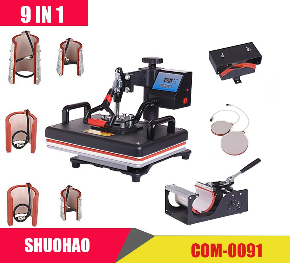 8 IN 1 NEW DESIGN COMBO HEAT PRESS MACHINE= 4 PCS mug press pad (different size) + 1 set cap press pad + 1 set flat T-shirt pres pad + 2 PCS plate press machine