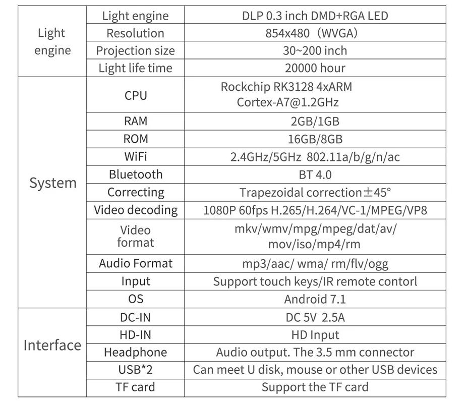 | Projection Technology: | USA TX 0.3DMD + RGB LED Light |